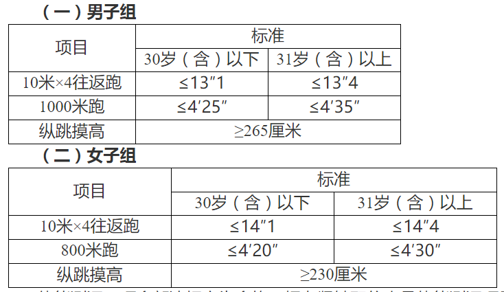 體能測評三項全部達標方為合格。報考緊缺職位人員體能測評項目三項中有兩項達標的,視為合格。體能測評項目中,縱跳摸高項目的測評次數(shù)不超過3次,10米×4往返跑項目的測評次數(shù)不超過2次,男子1000米跑、女子800米跑項目的測評次數(shù)為1次。
