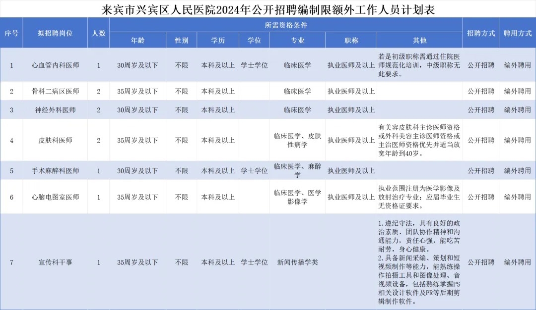 附件1:來賓市興賓區(qū)人民醫(yī)院2024年公開招聘編制限額外工作人員計(jì)劃表.xlsx