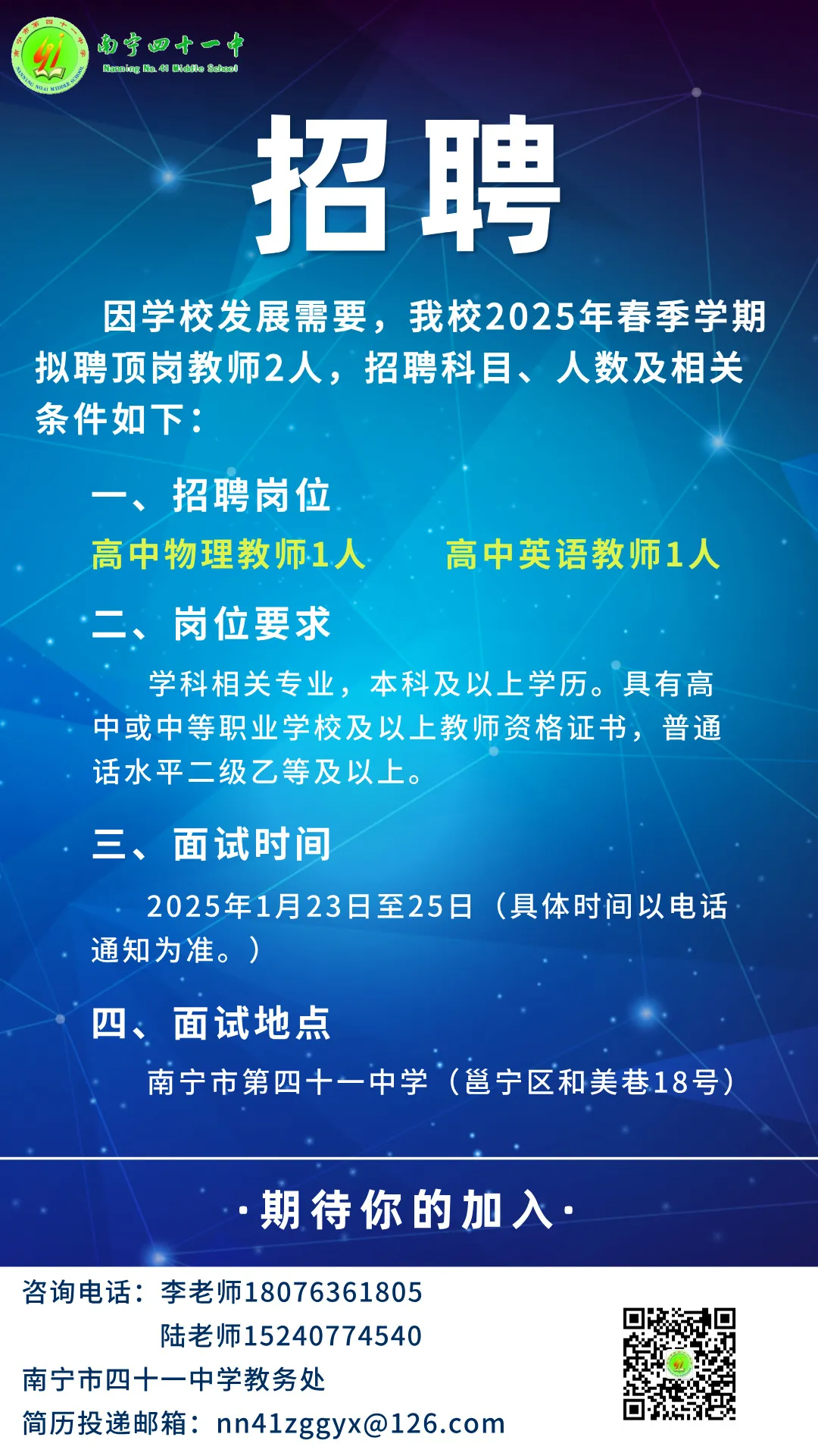 2025年春季學(xué)期南寧市第四十一中學(xué)關(guān)于公開(kāi)招聘頂崗教師2人