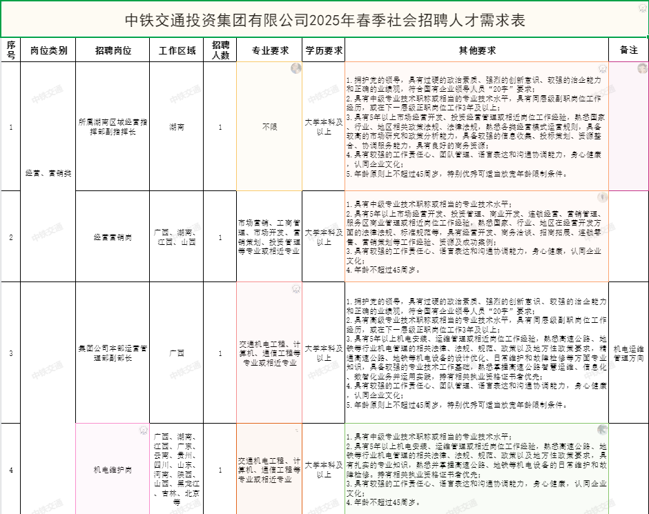 附件1:中鐵交通投資集團(tuán)有限公司2025年春季社會(huì)招聘人才需求表