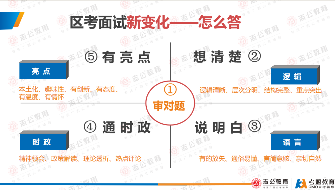 解決方法:一是進行面試脫敏。可以多進行考場還原和模擬,讓自己提早適應(yīng)面試緊張的氛圍和節(jié)奏。二是保持良好的答題狀態(tài)。考生在進入考場前,可以拿以前的模擬題或者預(yù)測題,條件允許的話可以大聲讀出來,再不濟也要默讀題目,快速思考,做到胸有成竹。三是掌握答題邏輯。思考之后心中已經(jīng)有對策的時候,可以適當(dāng)預(yù)留幾秒鐘思考如何說得清楚、讓人聽得明白。四是概括題目破題切入。這是最簡單有效的方法,不需要假大空,也不需要深度思考,以題目為抓手,但注意不要直接念題干。這種答題方式,可以給考官扣題作答的感受。