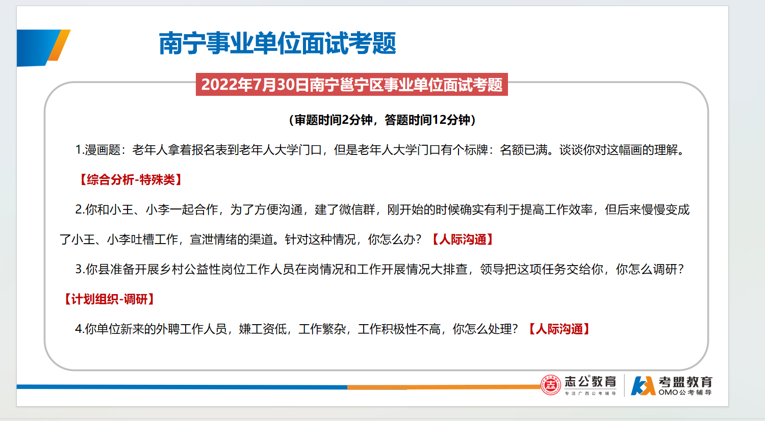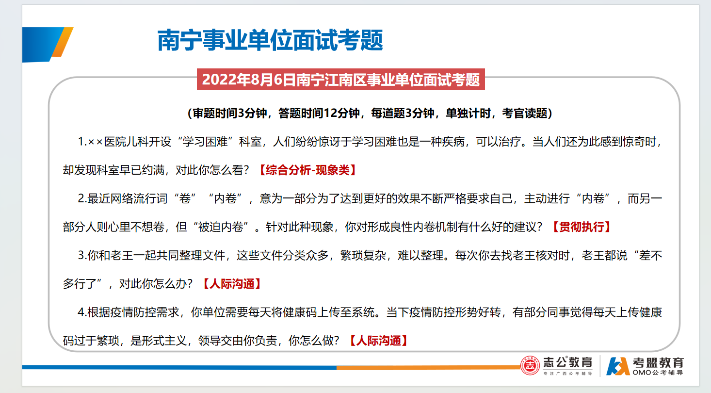 南寧事業(yè)單位面試主要采用結(jié)構(gòu)化面試形式、考查題量有3-4題,答題時間為9-12分鐘,考查題型:綜合分析(極高)、計劃組織(極高)、人際溝通(極高)、應(yīng)急應(yīng)變(一般)、貫徹執(zhí)行(一般)、自我認(rèn)知(一般):