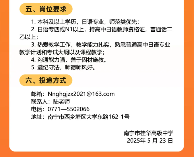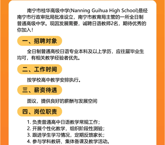 2025年廣西南寧市桂華高級(jí)中學(xué)面向社會(huì)公開(kāi)招聘日語(yǔ)老師2人