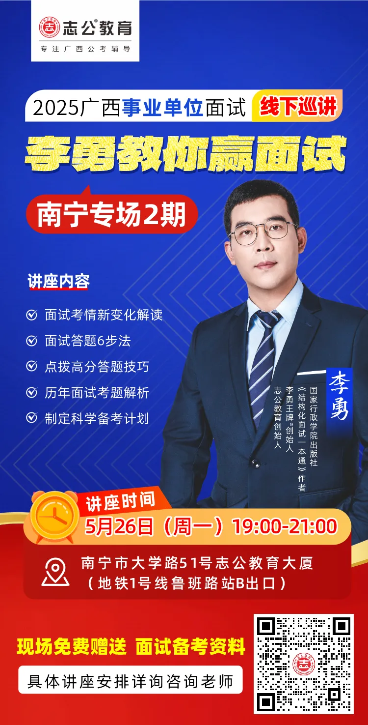 原文標(biāo)題:李勇教你贏面試!2025廣西事業(yè)單位面試線下巡講南寧專場今天等你來!