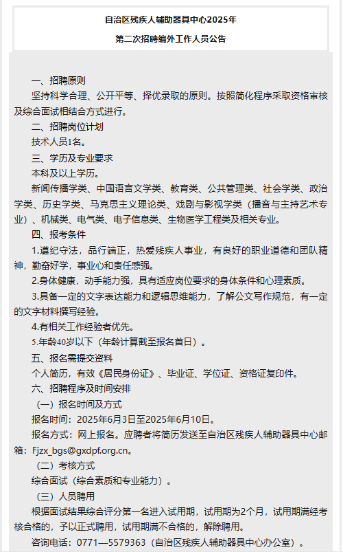原文標(biāo)題:自治區(qū)殘疾人輔助器具中心2025年第二次招聘編外工作人員公告