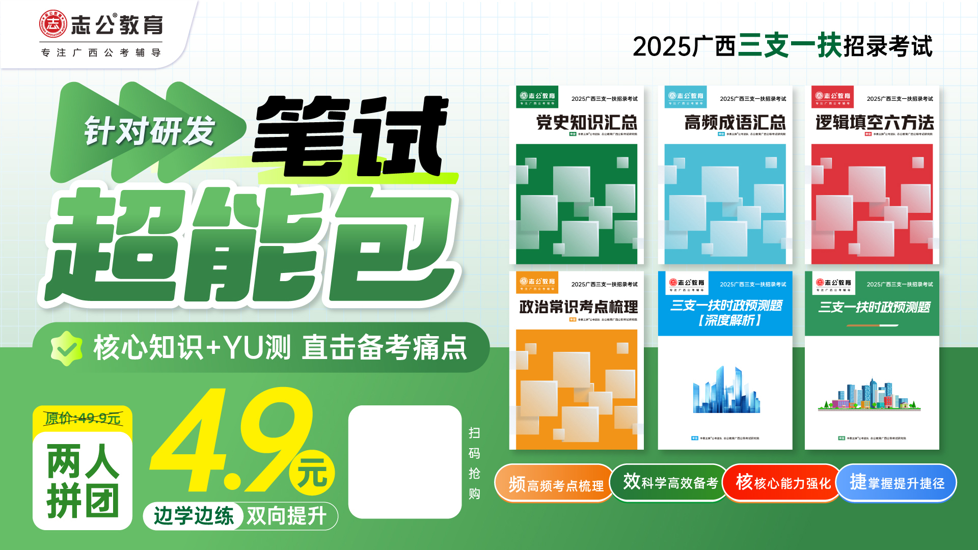 為助力青年群體高效備考,小志基于廣西地區(qū)歷年考試真題和考情分析,針對廣西地區(qū)“三支一扶”考試特點(diǎn),精準(zhǔn)把握命題趨勢。內(nèi)容緊扣考試大綱,覆蓋綜合知識、公共基礎(chǔ)知識及崗位相關(guān)實(shí)務(wù),幫助考生高效掌握核心考點(diǎn),為考生提供系統(tǒng)化、精準(zhǔn)化的備考支持。
