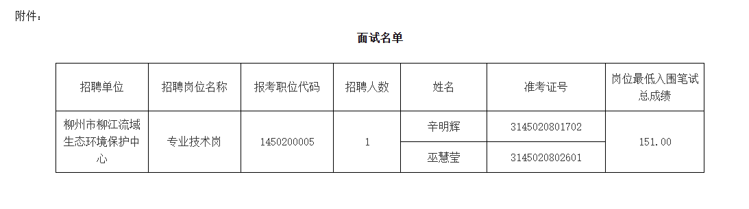 (三)成績(jī)公布:面試成績(jī)將于面試結(jié)束后當(dāng)天在柳州市生態(tài)環(huán)境局一樓公示欄進(jìn)行公示,并同步發(fā)布于柳州市生態(tài)環(huán)境局網(wǎng)站(http://sthjj.liuzhou.gov.cn),請(qǐng)考生自行查看。