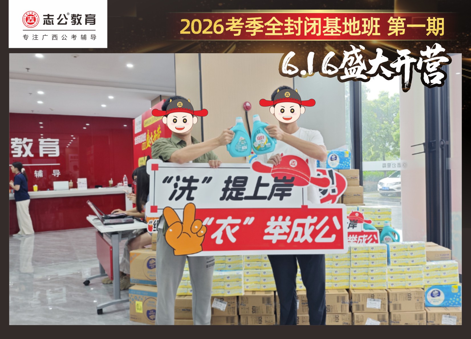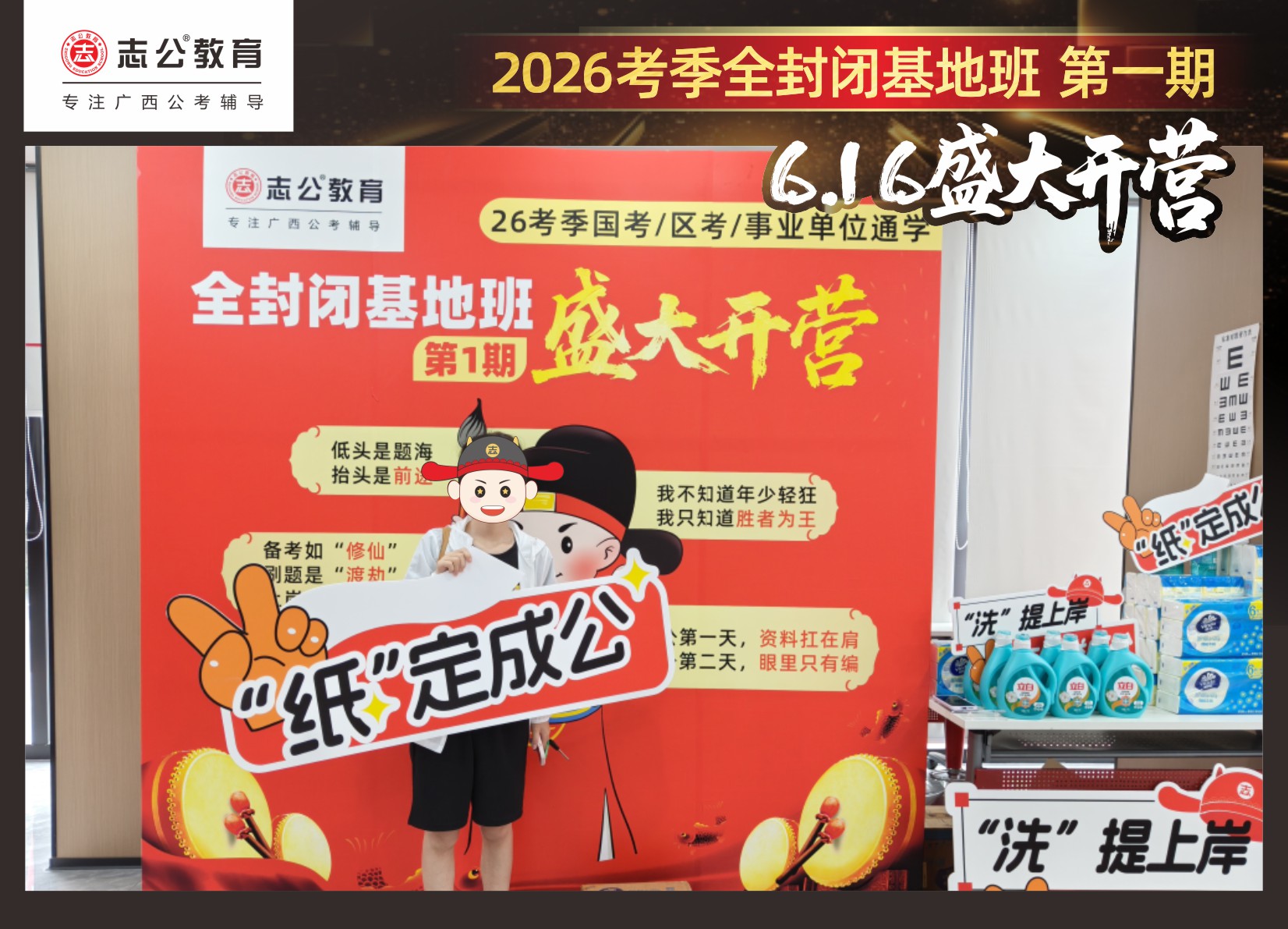 今天的開班還有一系列小活動(dòng)噢~瞧!——“學(xué)員打卡活動(dòng)”,所有今天到場(chǎng)的基地班學(xué)員,通過做一些小任務(wù)的方式,可以到前臺(tái)領(lǐng)取生活禮包即可領(lǐng)取生活禮品1份(一提六包的紙巾,或者一瓶洗衣液),這也是志公教育對(duì)所有學(xué)員的美好祝愿,預(yù)祝大家未來能夠“紙”定成公,“洗”提上/岸,“衣舉成公”!