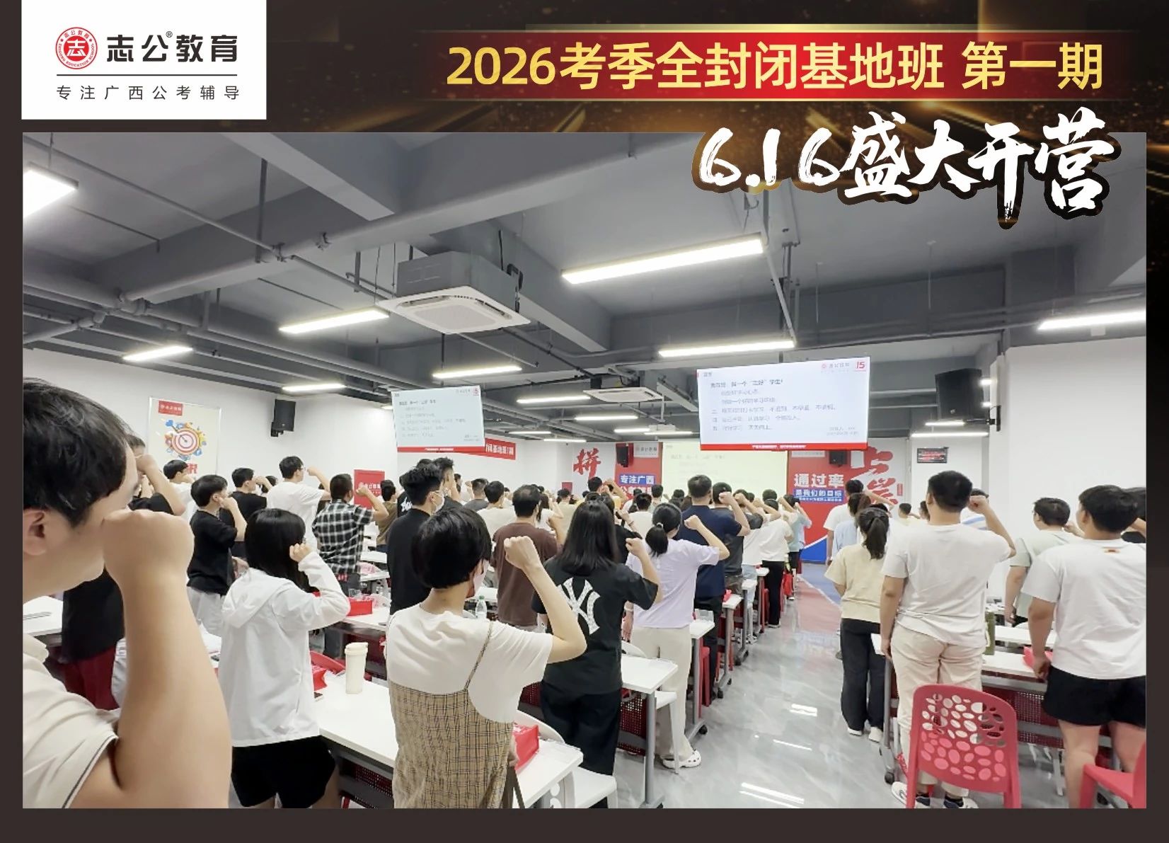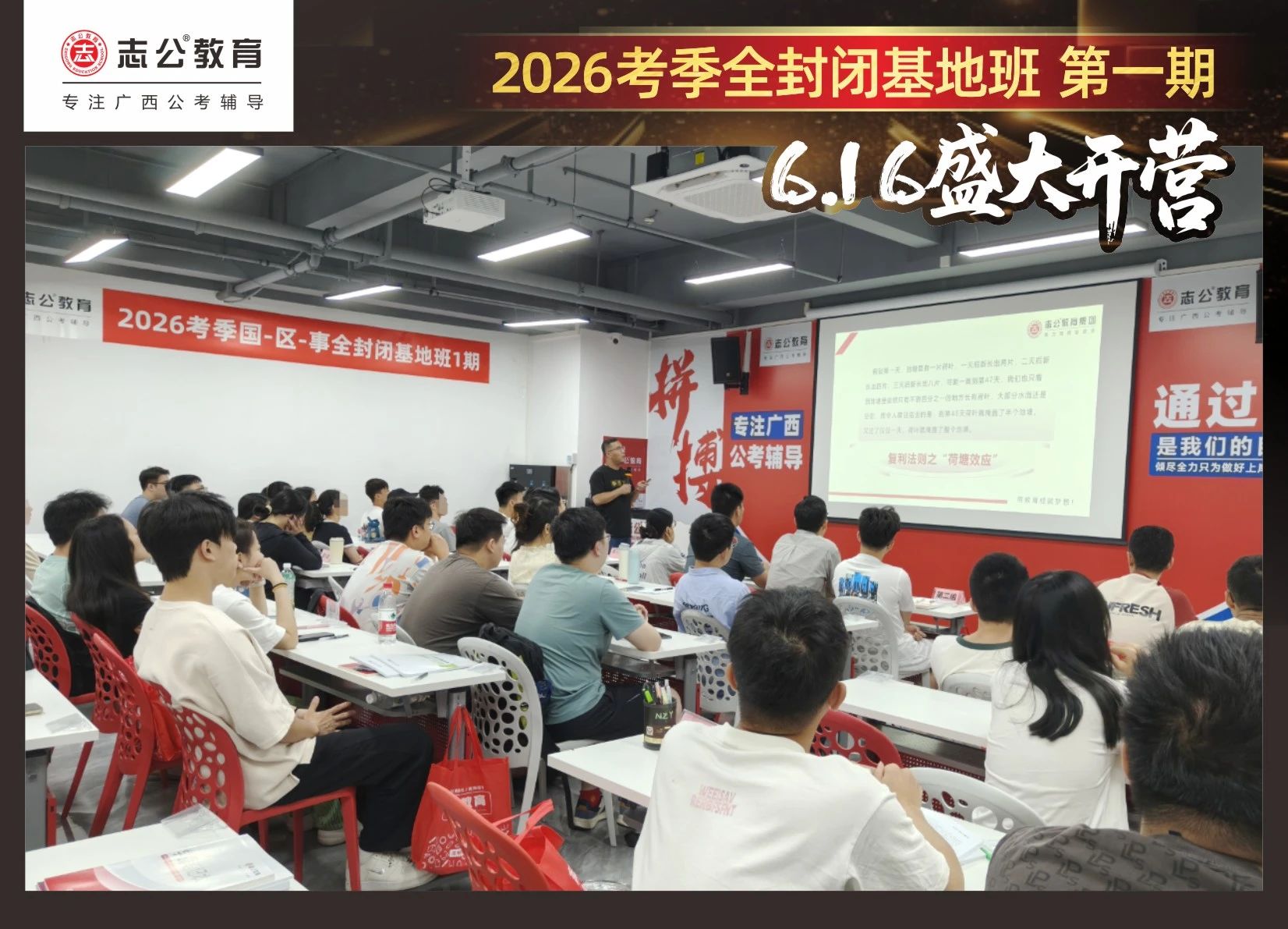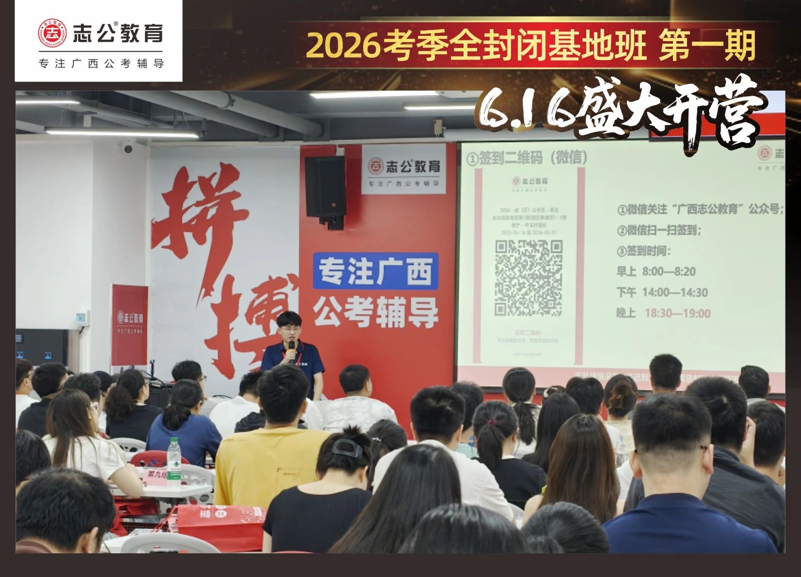 大家稍作休息之后,就是咱們期待已久的開班典禮啦!學(xué)員們?cè)诎嘀魅蔚囊龑?dǎo)下分組就坐。大家目光灼灼,熱情高漲,迫不及待想要開啟學(xué)習(xí)模式。看這座無虛席的盛況,志公26考季全封閉基地班第1期課程實(shí)力名不虛傳,各位學(xué)員用飽滿的熱情和積極的態(tài)度迎接此次課程的開展,期待大家能夠完成自己的蛻變和成長!