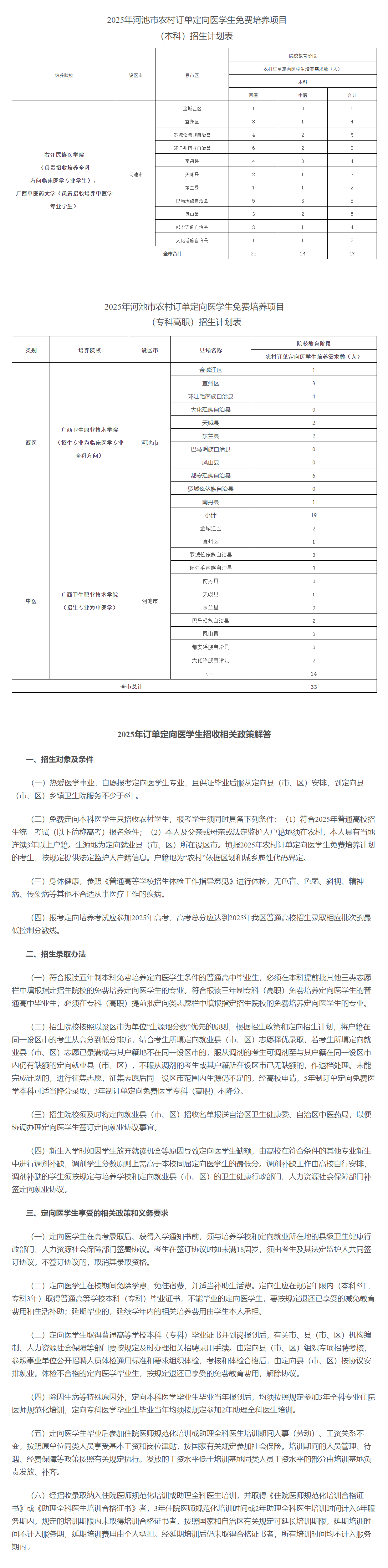 2025年,廣西繼續(xù)實施定向醫(yī)學(xué)生免費培養(yǎng)項目,面向全區(qū)招生。河池市共有80個名額,其中,本科47個,專科33個,培養(yǎng)院校分別為:右江民族醫(yī)學(xué)院、廣西中醫(yī)藥大學(xué)、廣西衛(wèi)生職業(yè)技術(shù)學(xué)院,培養(yǎng)專業(yè)為臨床醫(yī)學(xué)和中醫(yī)學(xué)。
