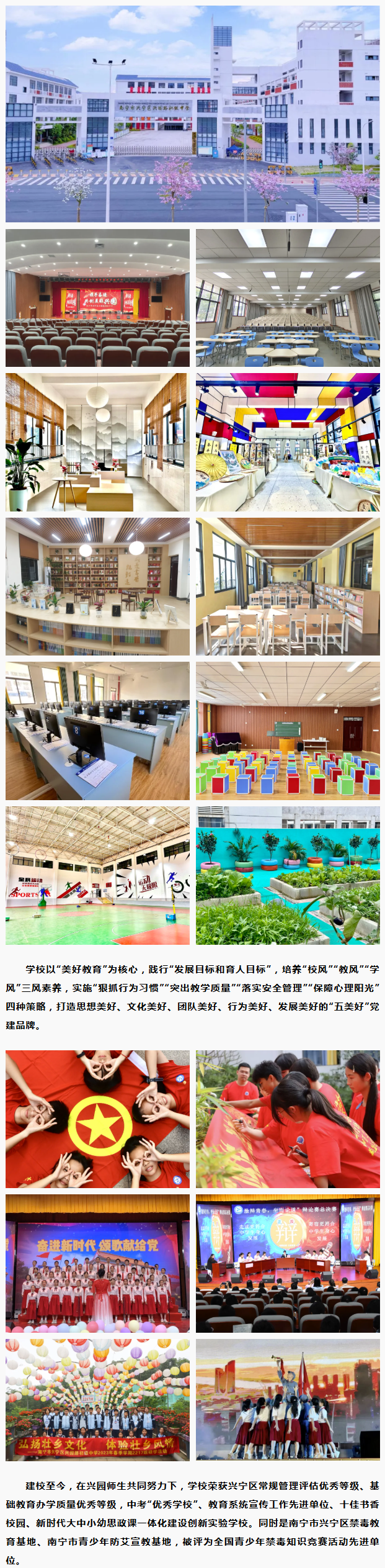 南寧市興寧區(qū)興園路初級中學2020年9月落成,于2021年9月獨立建制,是南寧市興寧區(qū)黨委、政府重點打造的一所現(xiàn)代化公辦初級中學,是興寧區(qū)教育領域中一個備受矚目、冉冉升起的教育明星!學校占地95畝,總建筑面積28241平方米,建設規(guī)模60個教學班,現(xiàn)在崗教職工200多人。教育教學設施齊全精良:室內(nèi)體育館、標準田徑場、大型活動報告廳、多媒體教室、賽課室、錄課室、校園電臺、各學科功能室和實驗室等。