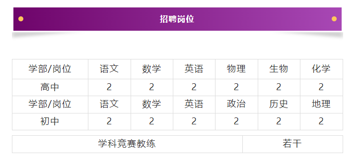 1.薪酬優(yōu)厚:青年教師8-10萬,骨干教師14-20萬,學(xué)科帶頭人20-30萬,學(xué)科競賽教練、教齡豐富且成績優(yōu)秀者面議。