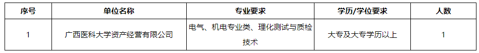 廣西醫(yī)科大學資產(chǎn)經(jīng)營有限公司(以下簡稱公司)是由廣西醫(yī)科大學于2011年8月3日獨資設(shè)立,經(jīng)營管理廣西醫(yī)科大學經(jīng)營性國有資產(chǎn)和對外投資的股權(quán)。公司依托學校和附屬醫(yī)院的資源優(yōu)勢,圍繞醫(yī)藥、養(yǎng)老、醫(yī)學檢驗、大健康項目等領(lǐng)域開展投資與合作,積極探索產(chǎn)學研協(xié)同發(fā)展。根據(jù)工作需要,現(xiàn)面向社會公開招聘工勤崗工作人員,具體招聘事宜如下: