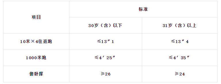 體能測(cè)試項(xiàng)目三項(xiàng)達(dá)標(biāo)的,視為合格。10米×4往返跑項(xiàng)目的測(cè)評(píng)次數(shù)不超過2次,1000米跑、俯臥撐等項(xiàng)目的測(cè)評(píng)次數(shù)為1次。