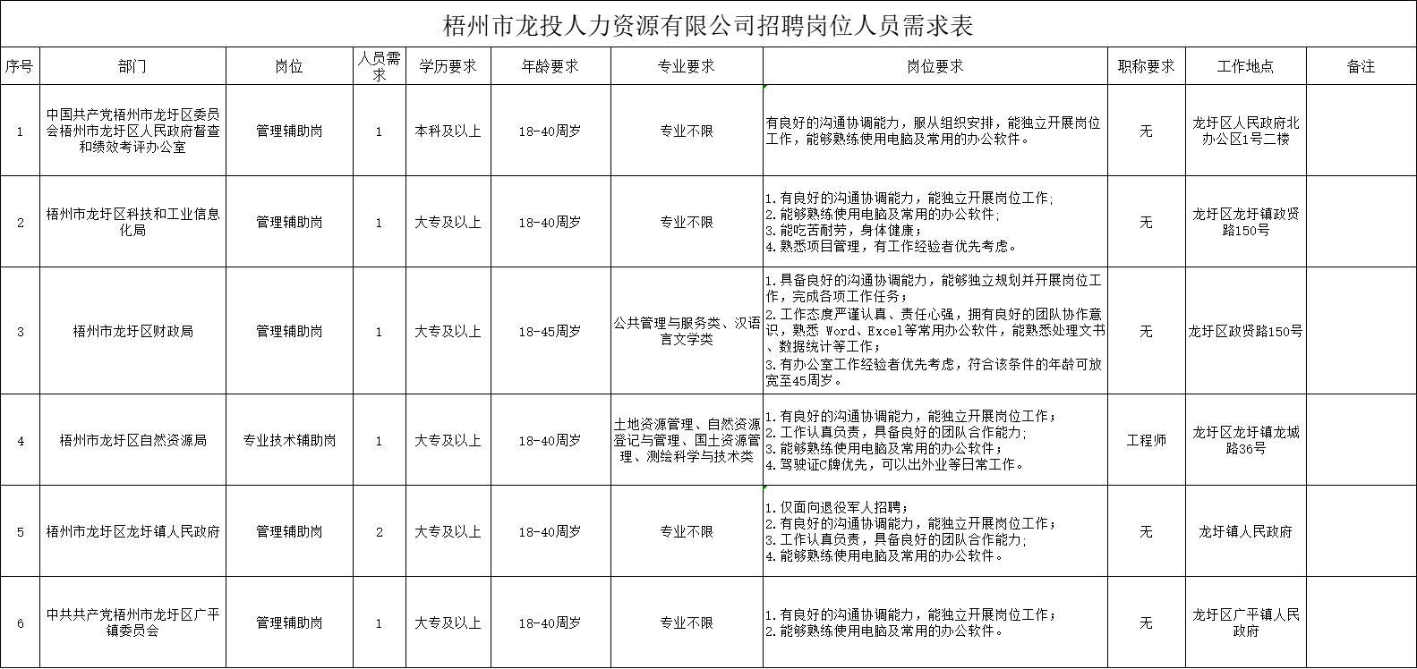 詳見(jiàn)附件1《梧州市龍投人力資源有限公司招聘崗位人員需求表》