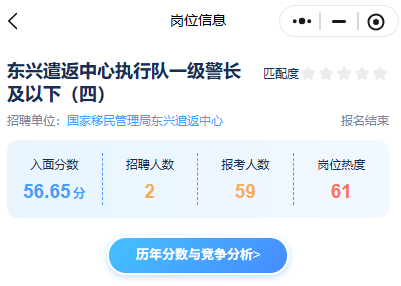 其中東興遣返中心執(zhí)行隊(duì)一級警長及以下(四)崗位歷年入面分為56.65分、報考人數(shù)為59人↓