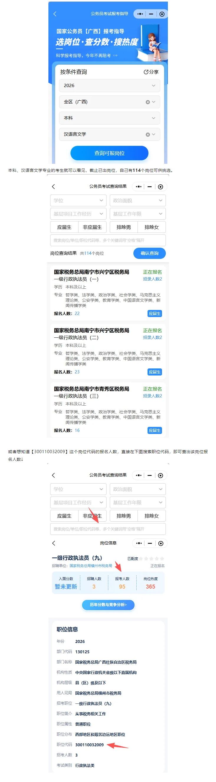 因為是處于國考選崗階段,我們更想知道選崗功能,思路是【選擇學歷】-【選擇專業(yè)】/輸入崗位代碼即可看見想查看的崗位,自己查看可以報名的大致崗位范圍及具體崗位的報名人數(shù),下面以2026年國考(廣西)崗位為例,比如,你是本科、漢語言文學專業(yè)的考生,選擇學歷-【本科】輸入【漢語言文學】選擇彈出來的分類目錄。