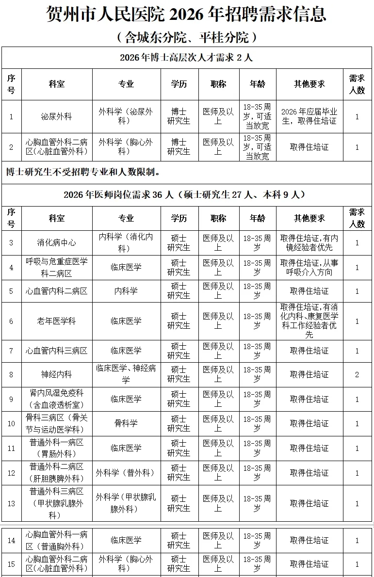 根據(jù)醫(yī)院發(fā)展規(guī)劃,招聘工作堅持公平公正公開,堅持德才兼?zhèn)?、人崗相適、擇優(yōu)錄取、雙向選擇的原則,2026年計劃引進(jìn)博士、碩士高層次人才及招聘工作人員共計50名(詳見附件:賀州市人民醫(yī)院2026年招聘需求信息)。