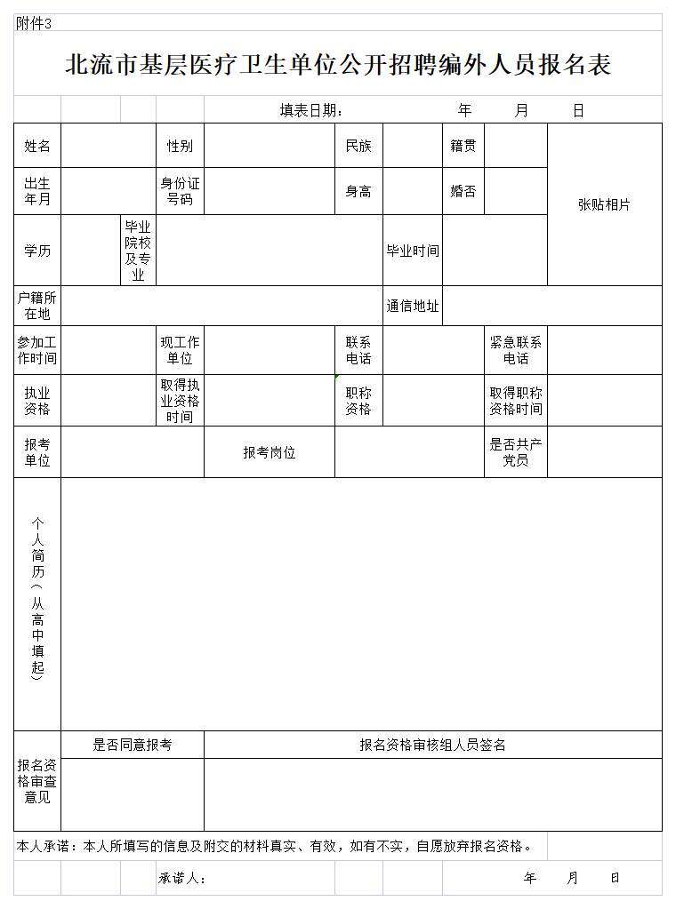 2.《北流市基層醫(yī)療衛(wèi)生單位公開(kāi)招聘編外人員報(bào)名表》(附件3);