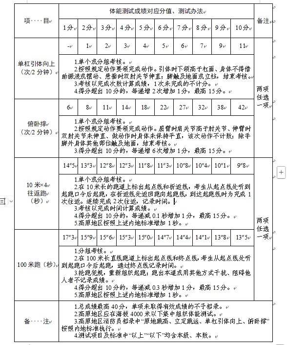 2.體能測試:(1)必考項目:1000米跑;(2)選考項目:①立定跳遠、原地跳高二選一;②單杠引體向上、俯臥撐二選一;③10米×4往返跑、100米跑二選一;(3)注意事項:體能測試有兩項及兩項以上不得分的視為不合格(標準參照附件)。未按時參加或因身體原因無法測試者,視為自動放棄。