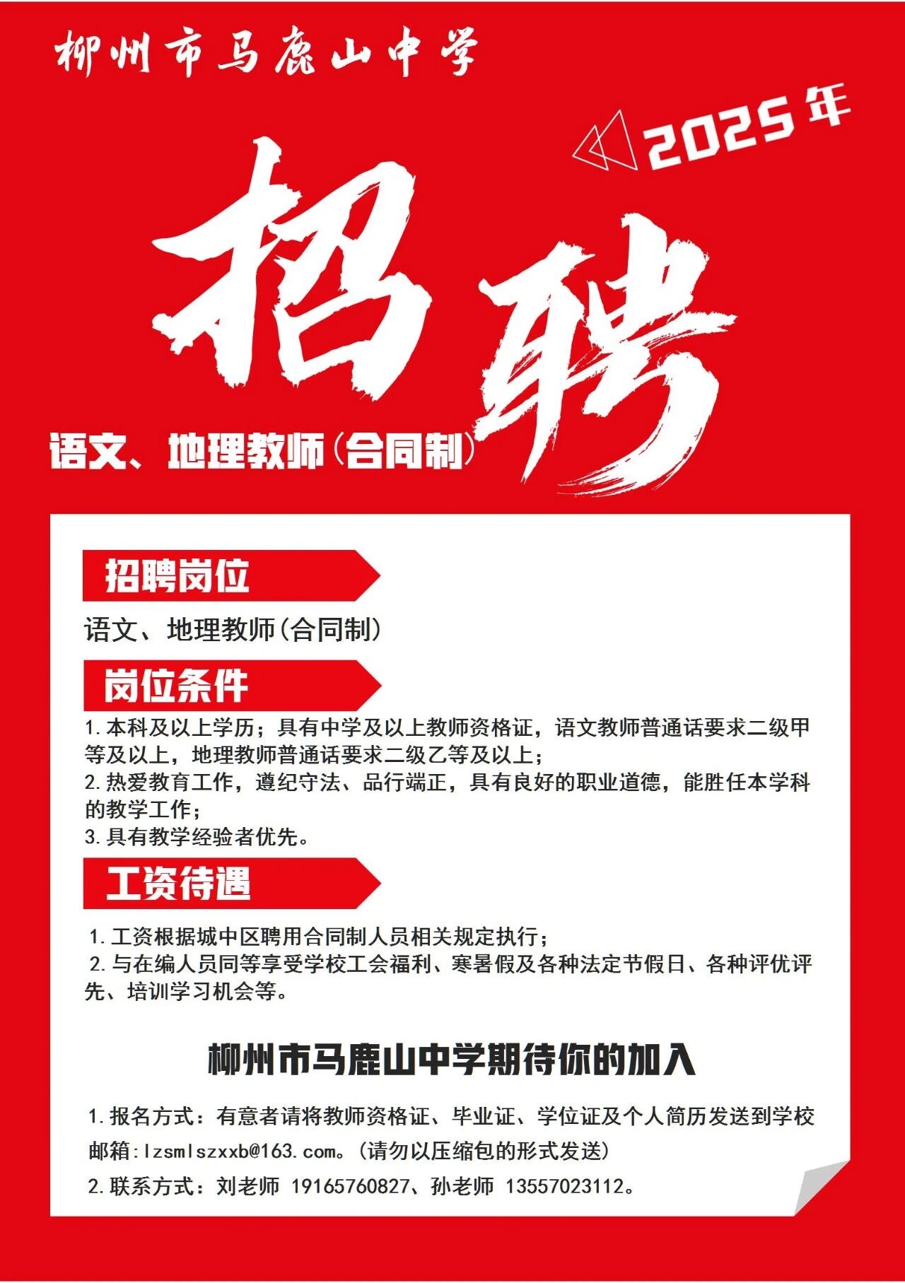 2025年柳州市馬鹿山中學(xué)招聘語文、地理教師