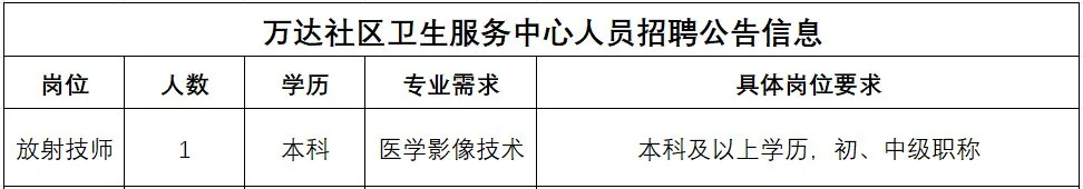 根據(jù)工作需要,銀山街道萬達(dá)社區(qū)衛(wèi)生服務(wù)中心現(xiàn)向社會招聘相關(guān)崗位人員,所有崗位按社區(qū)人員條件招聘,執(zhí)行社區(qū)待遇,具體崗位需求如下: