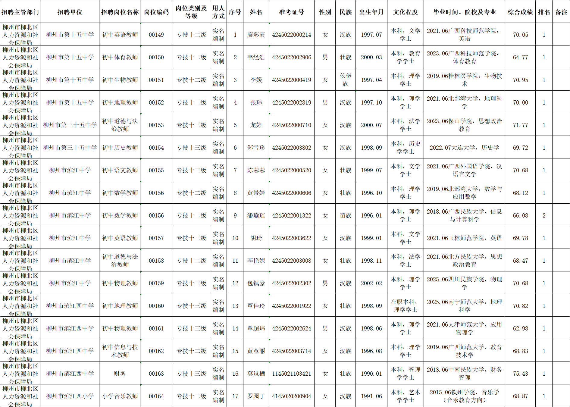 根據(jù)《柳州市2025年度下半年事業(yè)單位公開考試招聘工作人員公告》要求及安排,廖彩霞等17名同志經(jīng)面試、考察、體檢合格,符合聘用條件。經(jīng)研究決定,擬聘用廖彩霞等17名名同志為我區(qū)事業(yè)單位工作人員,現(xiàn)予以公示,公示期為5個工作日(2026年1月22日至2026年1月28日)。對擬聘用的同志如有異議,請以書面形式,并署真實姓名和聯(lián)系地址,于2026年1月28日前郵寄或直接送我單位(地址:柳州市勝利路12-8號柳北區(qū)政府3樓307室;郵編:545002,電話0772-2539121),群眾如實反映有關(guān)問題受法律保護。