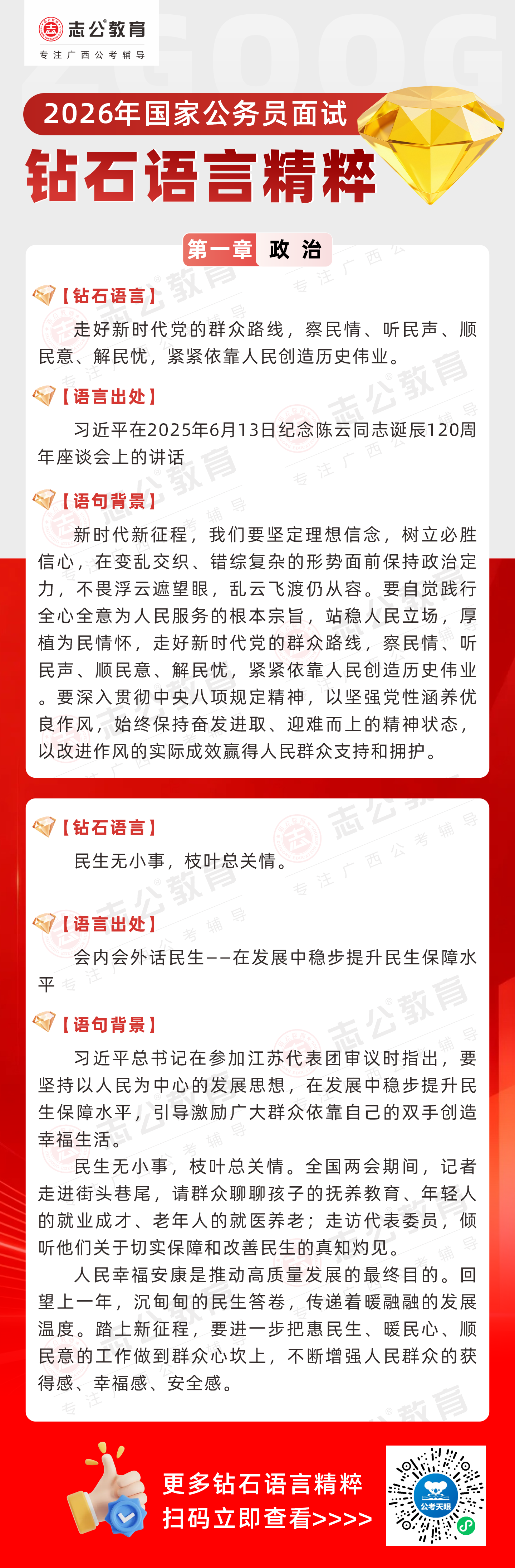 志公教育推出《2026國(guó)家公務(wù)員面試·鉆石語(yǔ)言精粹》政治篇!幫助考生把握政治類(lèi)題目應(yīng)答邏輯,提升語(yǔ)言表達(dá)層次,助你在面試中脫穎而出。備考2026國(guó)考面試,從掌握“鉆石語(yǔ)言”開(kāi)始!